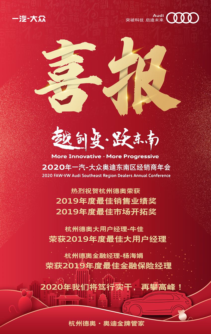 2020年1月6日,“越创变·跃东南”2020年一汽-大众奥迪东南区经销商会议在美丽的东海之滨---舟山隆重举行。杭州德奥汽车有限公司凭借2019年度优异的经营业绩及出色的运营表现,再次获得多项殊荣:年度最佳销售业绩奖、年度最佳市场开拓奖、年度最佳大用户经理、年度最佳金融保险经理。