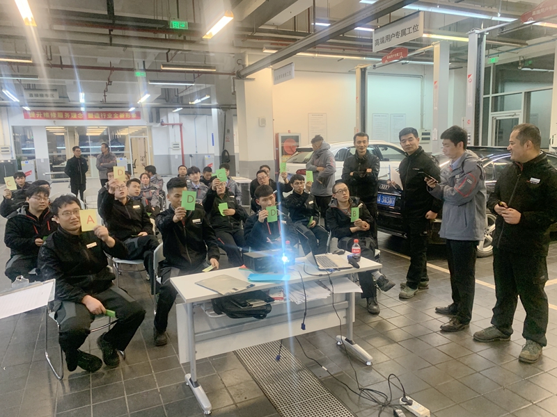 晚上6点,技能比武大赛正式拉开帷幕,技术经理张志斌首先宣读竞赛项目、竞赛流程、竞赛规则及注意事项,然后,由服务总监张鋆宣布比赛正式开始。本次技能比武大赛共有13名机电维修技师参加,比赛遵循奥迪服务标准流程,分理论知识与实操竞赛两部分。在理论知识竞赛中,有40道单选题和多选题,按照赛制规定,选手们必须在20秒内抢答完所有题目,同时还得保证零错误率,否则扣分,整场抢答过程异常激烈。稍作休息后进入实操竞赛单元,在实操竞赛中严格按照奥迪厂家服务技术标准流程进行,以服务流程、TPI、保养故障点三个维度开展。经2小时的激烈竞逐,最终,机电维修技师沈海涛拔得头筹获得第一名,方鑫获得第二名,张承斌获得第三名。