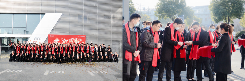 在杭州德奥,汽车事业部董事长莫见忠、汽车事业部执行总经理兼杭州德奥总经理沈美琴携各部门总监给全体员工分发新年旺旺礼包,寓意在新的一年开启美好的征程。