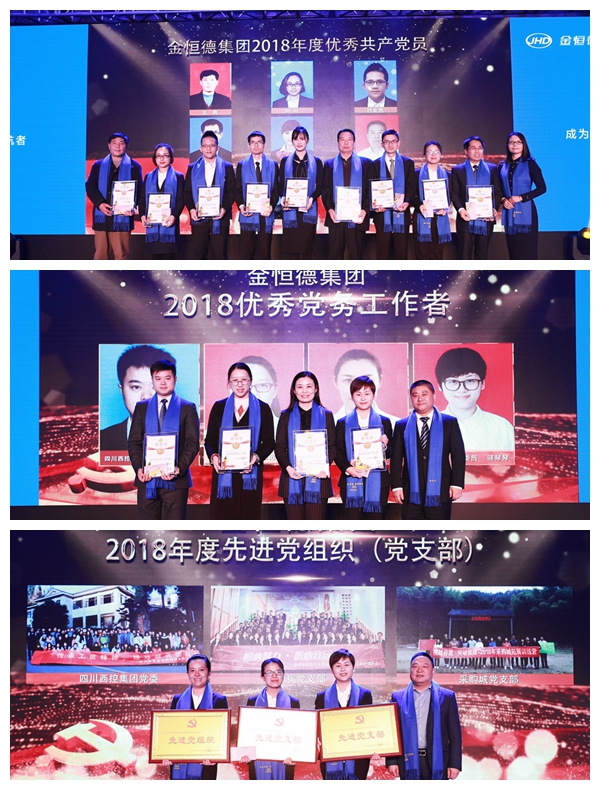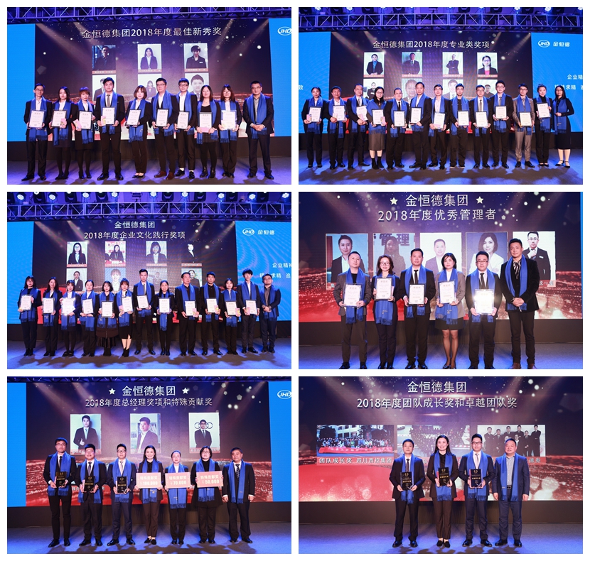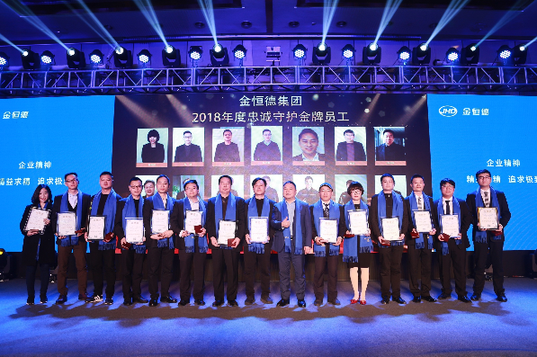 在2018年度颁奖盛典上,集团董事长周金法、集团高级副总裁郑坚鑫、集团董事陈磊、副总裁周智恒、副总裁陶建军、副总裁杨树丹分别为集团先进集体和个人颁奖。除了颁发党内先进的奖项和集团特殊贡献奖、卓越团队奖、团队成长奖、总经理奖项、优秀管理者、企业文化践行奖项、专业类奖项等奖项,还特别设立了 “忠诚守护金牌员工”荣誉,为那些伴随金恒德发展并忠诚守护了十年的元老们颁发金恒德纪念金牌和荣誉状。