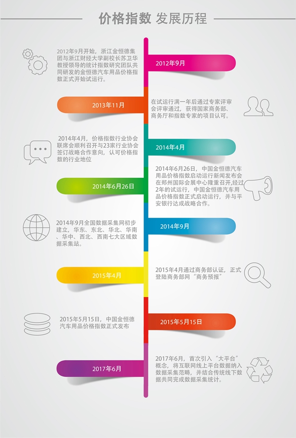 中国金恒德汽车用品价格指数 是反映不同时期一组商品(服务项目)价格水平的变化方向、趋势和程度的经济指标,是经济指数的一种。以汽车用品为例,对汽车后市场产品生产企业、采购商以及上下游关联企业或行业来说,汽车用品价格指数具有价格指导功能、提供经营决策信息功能与市场预测功能,是汽车用品行业发展的风向标。